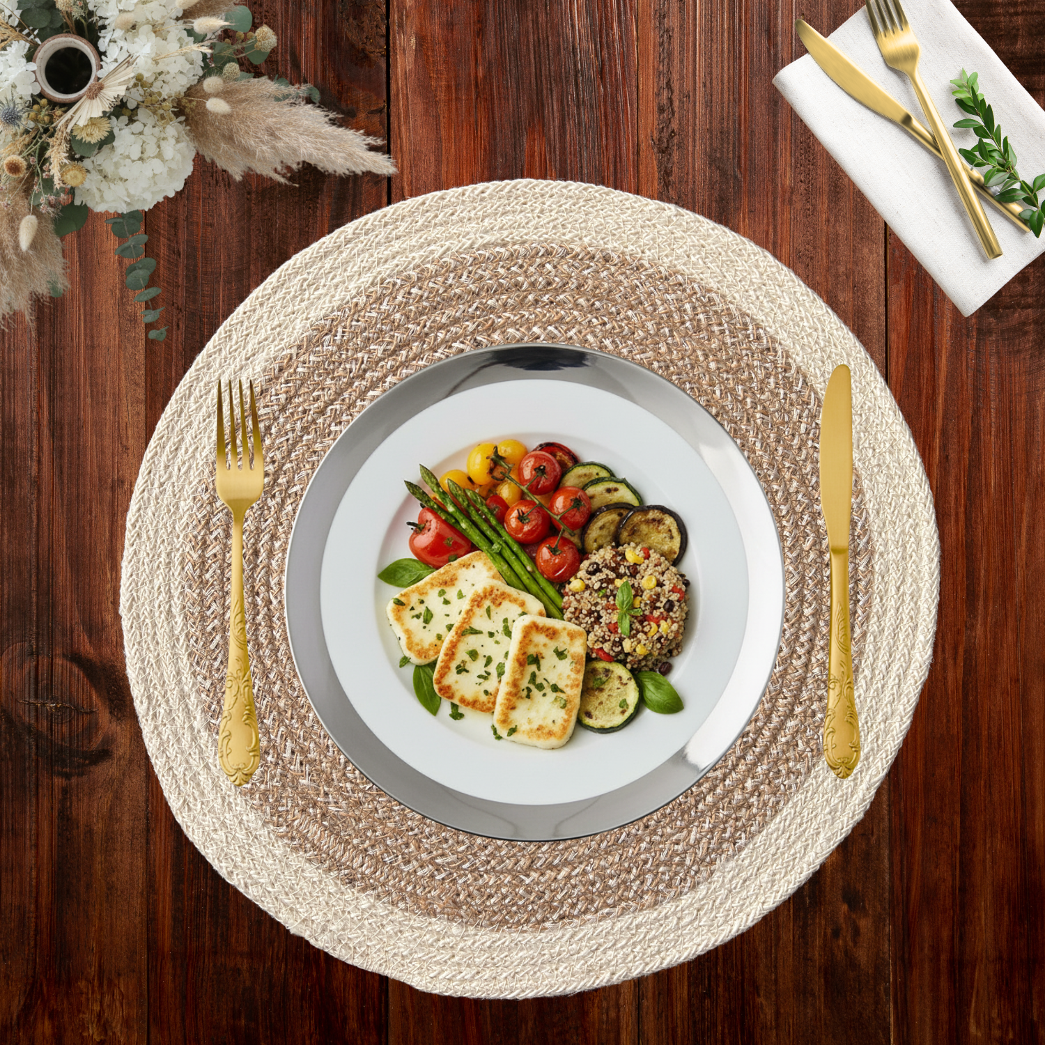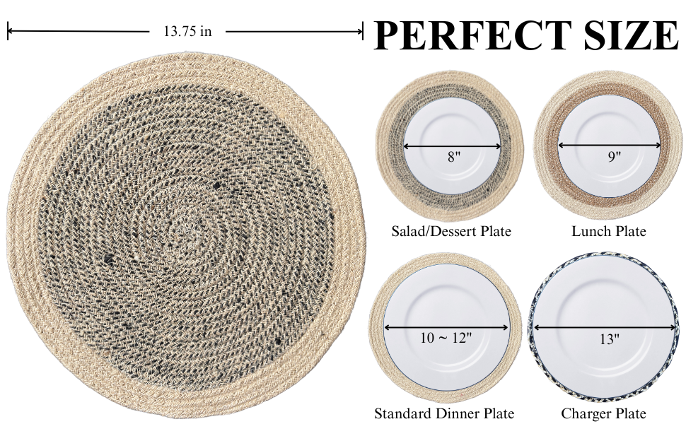 The Ideal Charger Plate:Â Designed to accommodate standard dinner plates (10-12 inches) while leaving an attractive, visible border, this mat serves beautifully as a stylish, functional charger plate for special occasions and daily meals.
